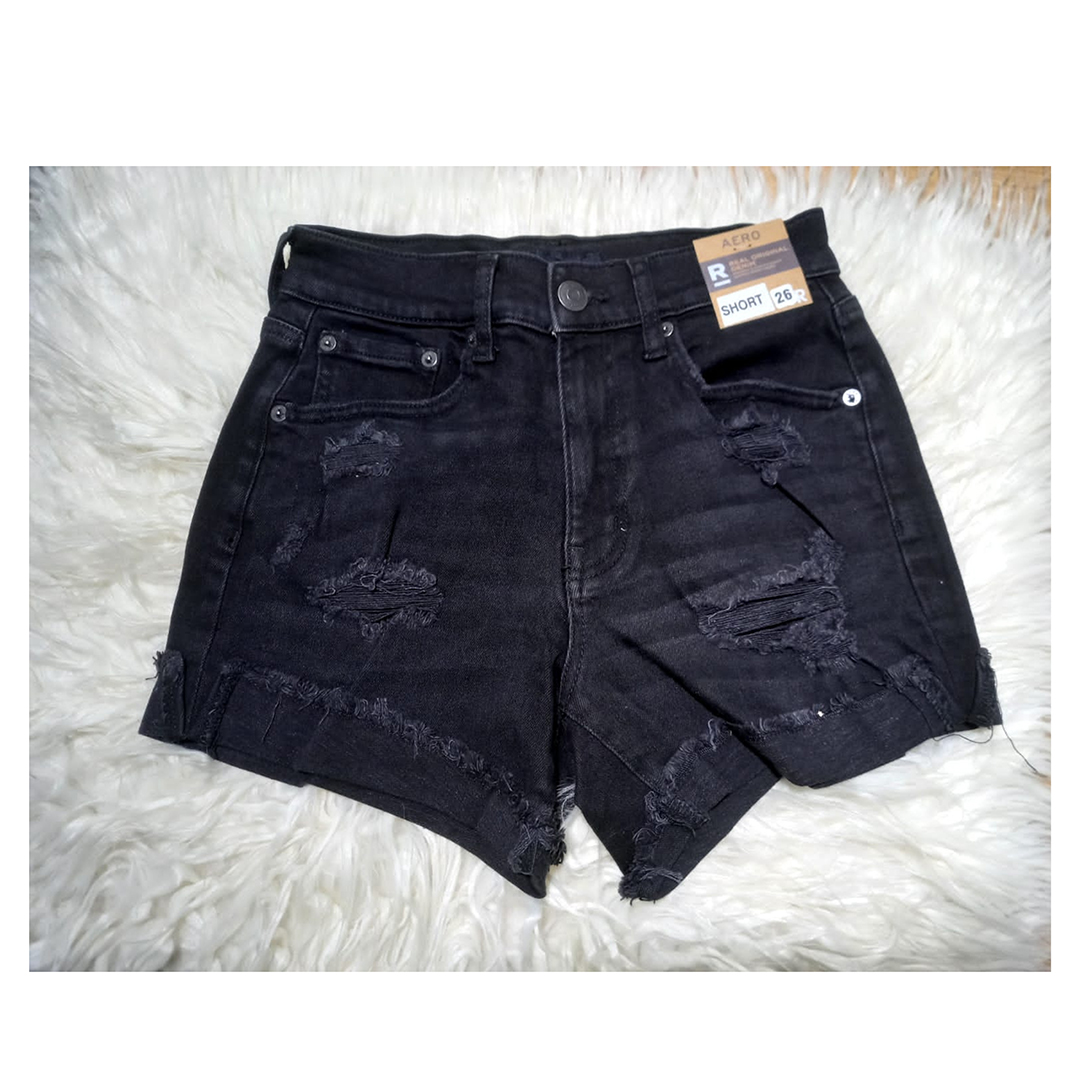 Distressed Black Denim Shorts Embrace the effortlessly cool vibe with these distressed black denim shorts. Designed for those who love a bold and edgy style, these mid-rise shorts feature raw hems and distressed details throughout, adding texture and character to your outfit. The washed black finish gives a modern, urban look, making these shorts a versatile staple for casual days. Pair them with your favorite tee or tank top for an effortlessly chic appearance.